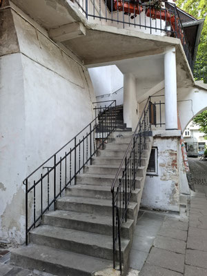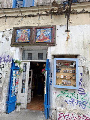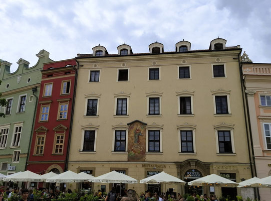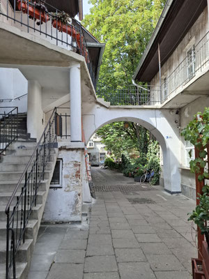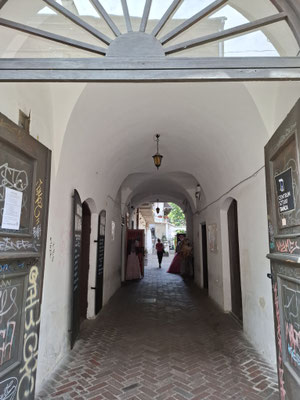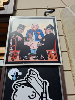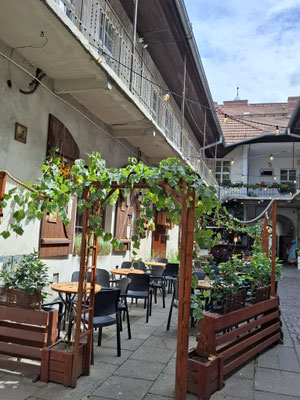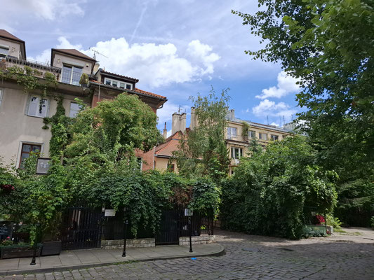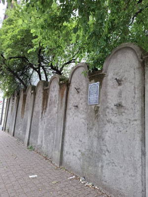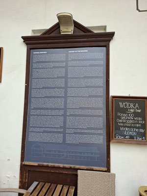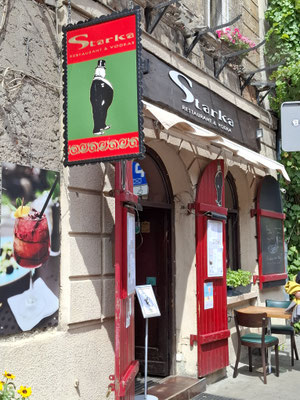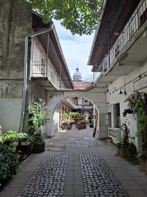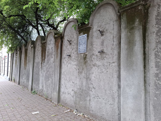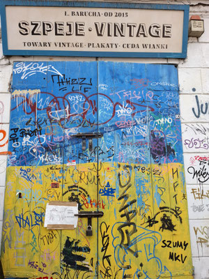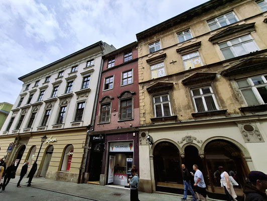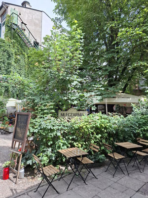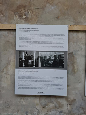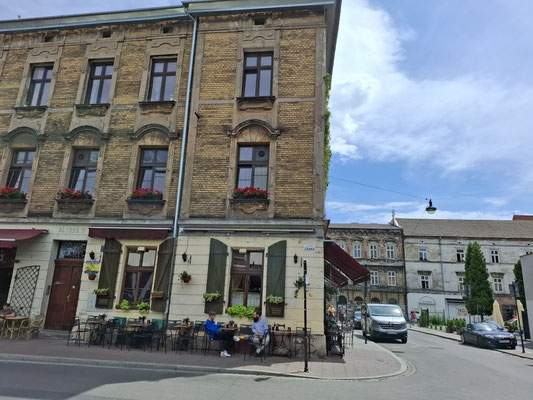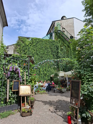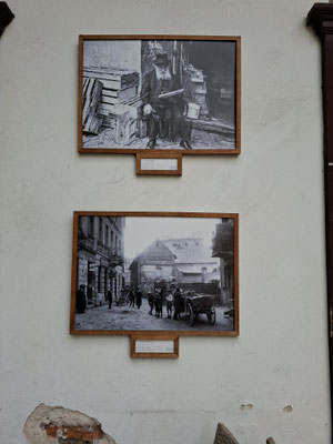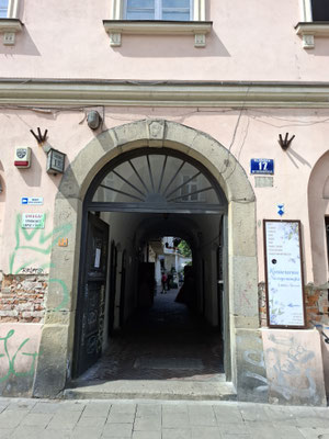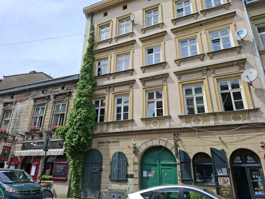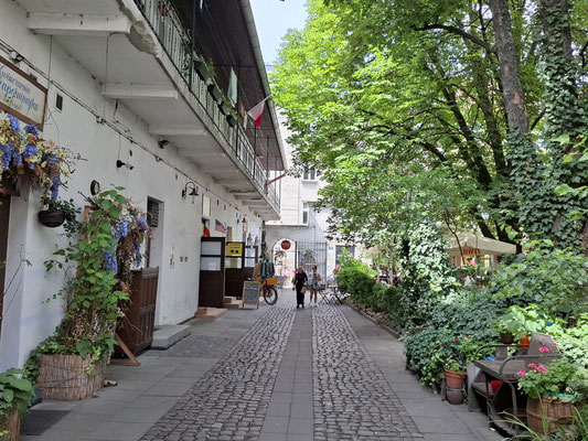 Wir schauen uns den Hof der Jozefa 12 an – hier wurde für den Film die Deportation aus dem Ghetto gedreht. Auch hier begegnet uns wieder beides: Erinnerungskultur und heutiges Leben. Es gibt Gedenktafeln und Texte und daneben Lädchen, eine Parfümerie, ein Biergarten und Galerien.