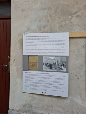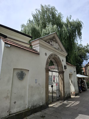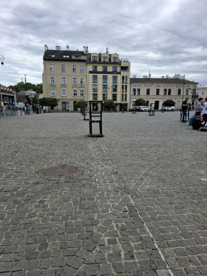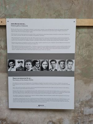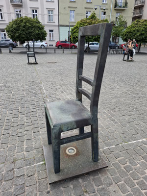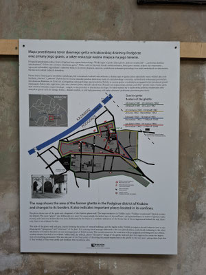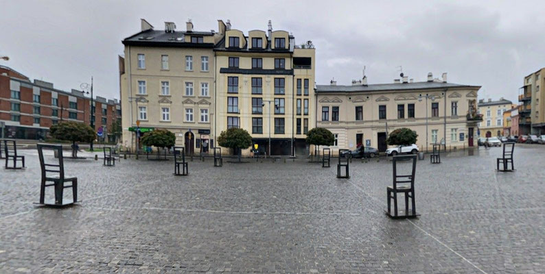 In Kazimierz lebte seit dem Mittelalter eine große jüdische Gemeinschaft, die die Kultur der Stadt stark prägte. Vor Ausbruch des Zweiten Weltkriegs wohnten in Krakau über 64000 Juden und Jüd*innen, etwa 25% der Gesamtbevölkerung. Nach den Zwangsdeportationen blieben noch etwa 16000 übrig. Während des Krieges wurde die jüdische Bevölkerung in das Ghetto von Podgórze gezwungen. Dieses war von einer drei Meter hohen Mauer umgeben, deren Rundbogenbekrönung bewusst jüdischen Grabsteinen – einer Mazewa – nachgebildet war. Familien lebten hier seit 1941 in überfüllten Wohnungen; Hunger, Zwangsarbeit und Gewalt prägten den Alltag. Immer wieder kam es zu Deportationen in Konzentrations- und Vernichtungslager, insbesondere nach Bełżec. Am 13. und 14. März 1943 erfolgte die endgültige Auflösung des Krakauer Ghettos durch die deutschen Besatzungsbehörden. Ein Teil der Bewohner wurde in das Konzentrationslager Plaszów deportiert, andere unmittelbar vor Ort ermordet. Heute erinnert der Bohaterów-Getta-Platz an diese Ereignisse. Das dort errichtete Mahnmal besteht aus zahlreichen leeren Stühlen, die auf dem Platz verteilt sind. Sie symbolisieren die Enteignung des persönlichen Lebensraums, die gewaltvoll vertriebenen Menschen und die große Leere, die der Holocaust in Krakau hinterlassen hat. Heute sind vom Ghetto nur noch Teile der Mauer erhalten. Die Inschrift, die hier angebracht ist lautet: „Hier haben sie gelebt und gelitten und sind von den Nazi-Henkern ermordet worden.Von hier aus führte ihr letzter Weg in Vernichtungslager.“
