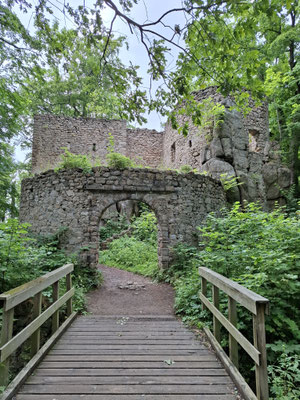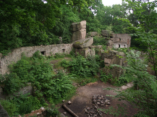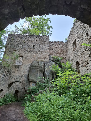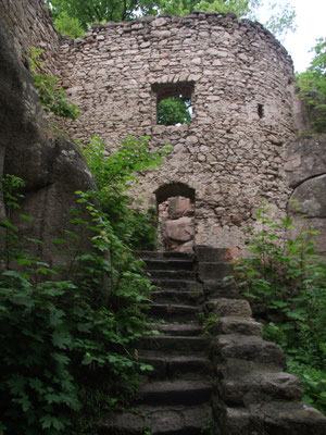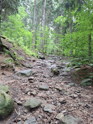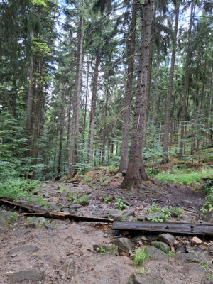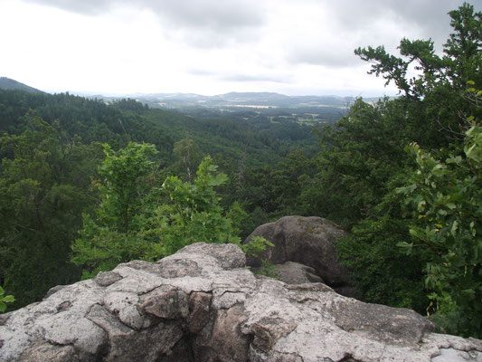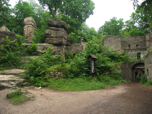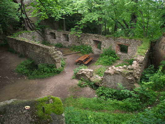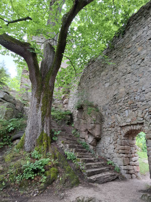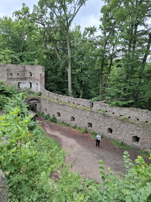 welches 1374 erstmal erwähnt und wie so viele Burgen mehrfach neu erorbert, halb zerstört, wieder aufgebaut, verteidigt und verloren wurde. Es gehört zum Kulturpark Hirscherger Tal, einem großen Talkessel auf der schlesischen Nordseite der Westsudeten. Der Aufstieg ist steil und geht über unebenen Waldboden, Stock und Stein, kleine Wasserläufe. Nach einer Stunde bin ich oben, Daniel ist natürlich schneller. Belohnt wird man mit einer wunderschönen Felsenburg.