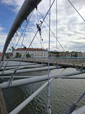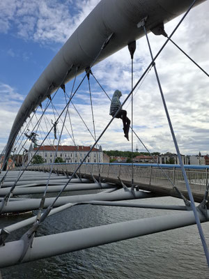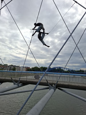 Wir laufen Richtung Süden und überqueren die Weichsel auf der Pater-Laetus-Bernatek-Brücke. Sie verbindet Kazimierz und Podgorze. Neun akrobatische Figuren des polnischen Bilhauers Jerzy Kędziora schweben über unseren Köpfen.