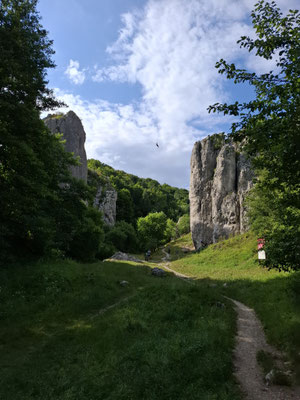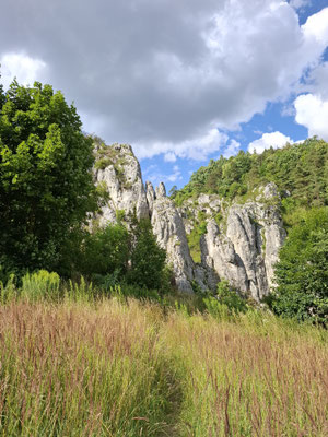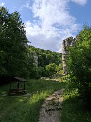 Felswände, die sogenannten „Brama Bolechowicka“, wie ein steinernes Tor in die Höhe. Dahinter führt ein idyllischer Weg durch die enge Schlucht, vorbei an steilen Felsen und Höhlen. Besonders