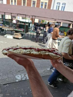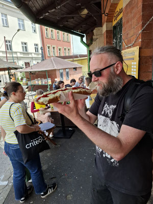 In dieser Gleichzeitigkeit (von Tourist*in sein, sich der Geschichte widmen und dem Erleben des heutigen Krakau) die Straßen entlangzulaufen fällt hier und da schwer. Man möchte diese Orte sehen, ist es schuldig, wie könnte man sich dem entziehen – gerade als Deutsche*r. Und zur selben Zeit blüht das heutige Leben auf den Straßen. Kazimierz ist ein lebendiges Viertel mit Cafés, Restaurants und Kulturveranstaltungen. Hier findet man Synagogen, kleine Höfe, Friedhöfe und koschere Einkaufsmöglichkeiten, kleine Lädchen, handgemachte Souvenirs, kreative Dinge. Wir holen uns am Plac Nowy, wo sich ein Stand an den anderen reiht, ein typisches Krakauer Streetfood - ein Zapienka. Es ist ein großes Baguette, im Ofen überbacken mit verschiedensten Belägen und getoppt mit scharfer Sauce, Knoblauchdip oder Ketchup.